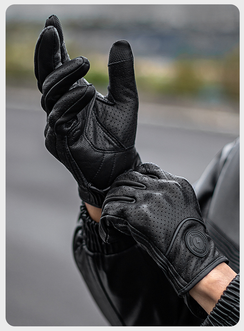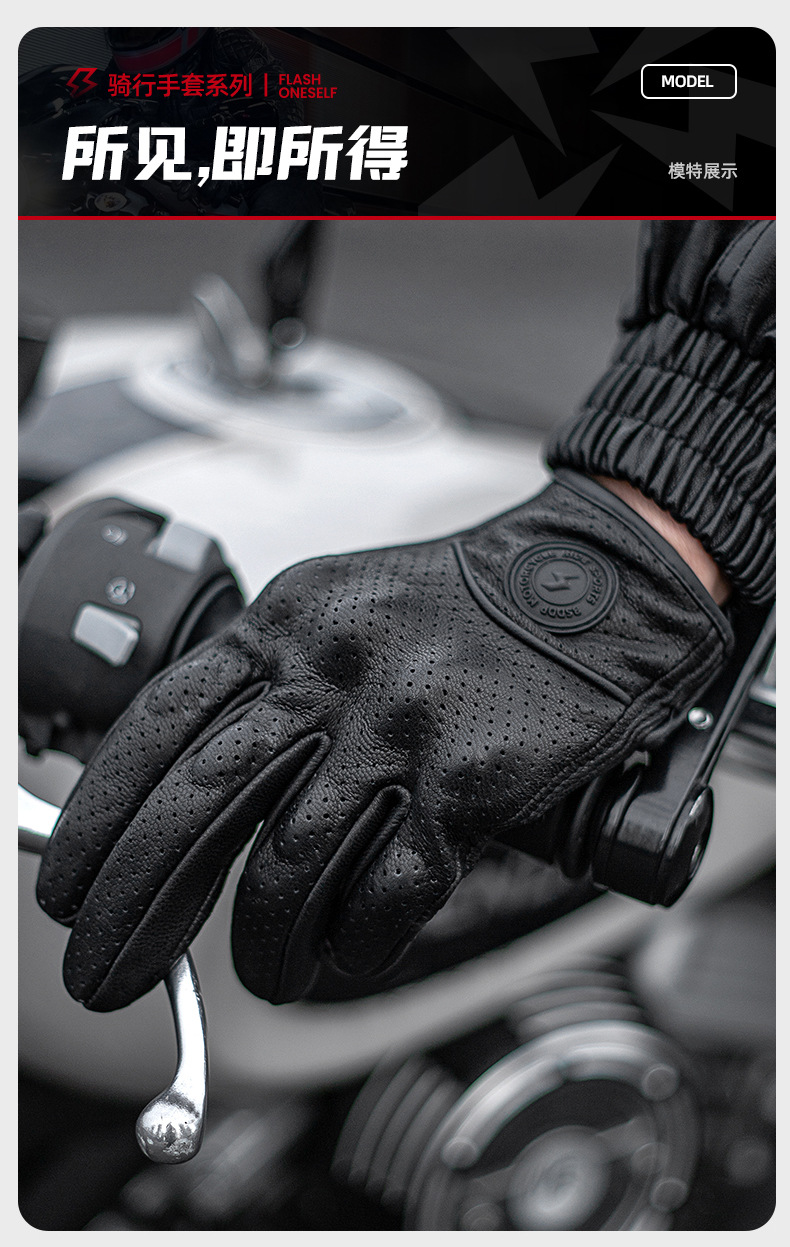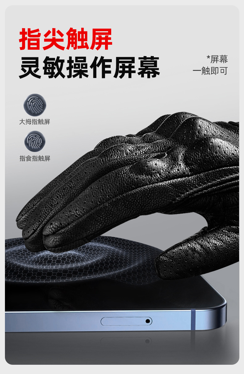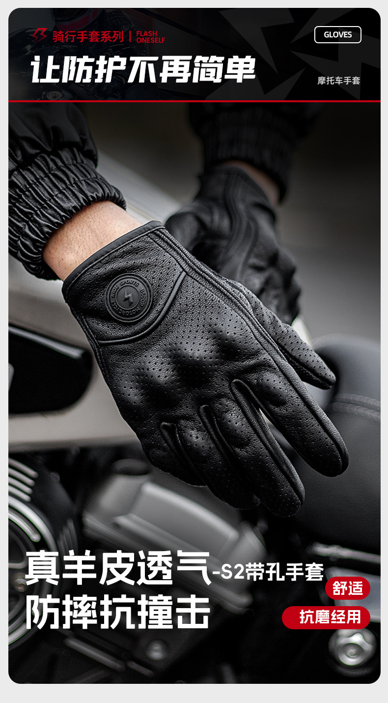 ┈厂家直销羊皮手套全指打孔透气越野机车赛车防摔透气触屏手套男